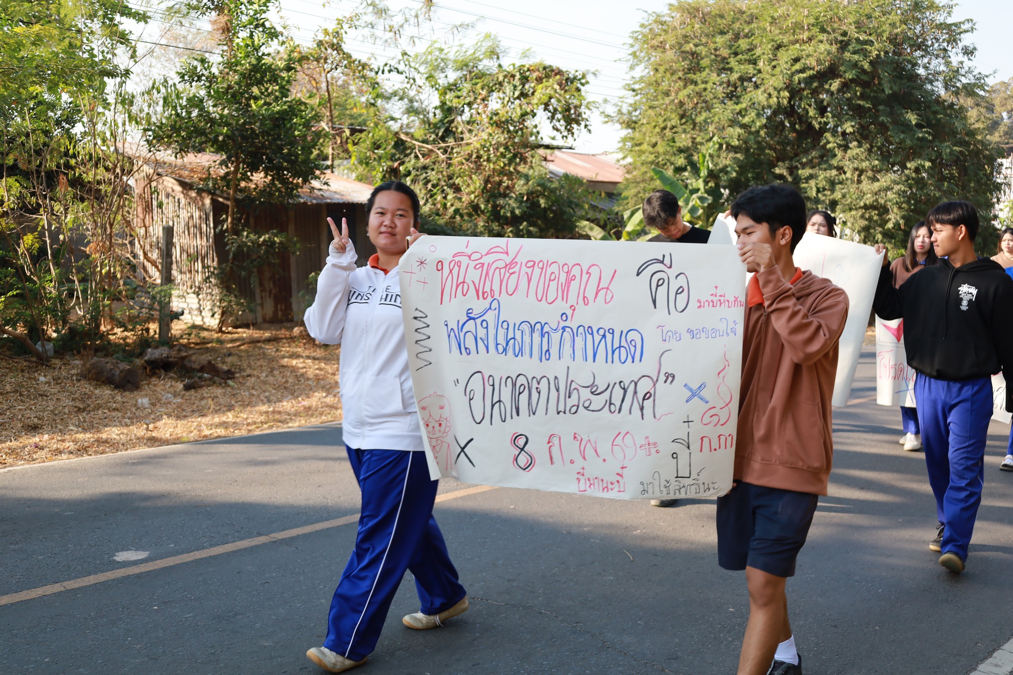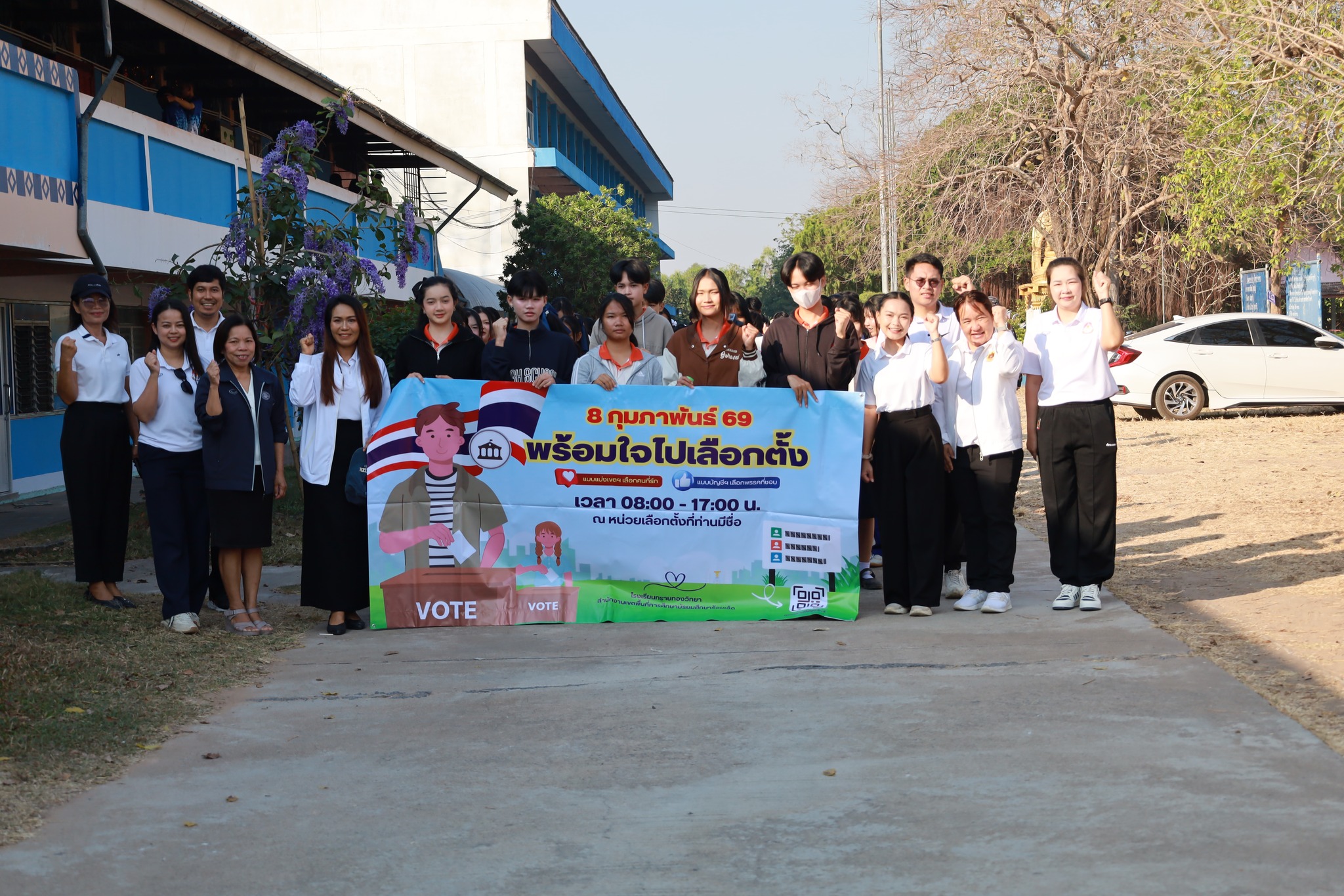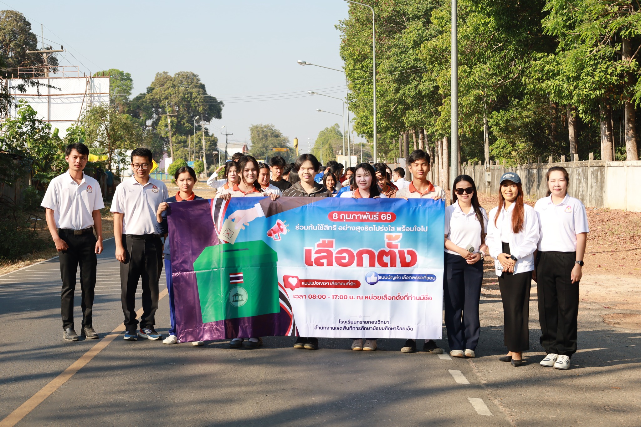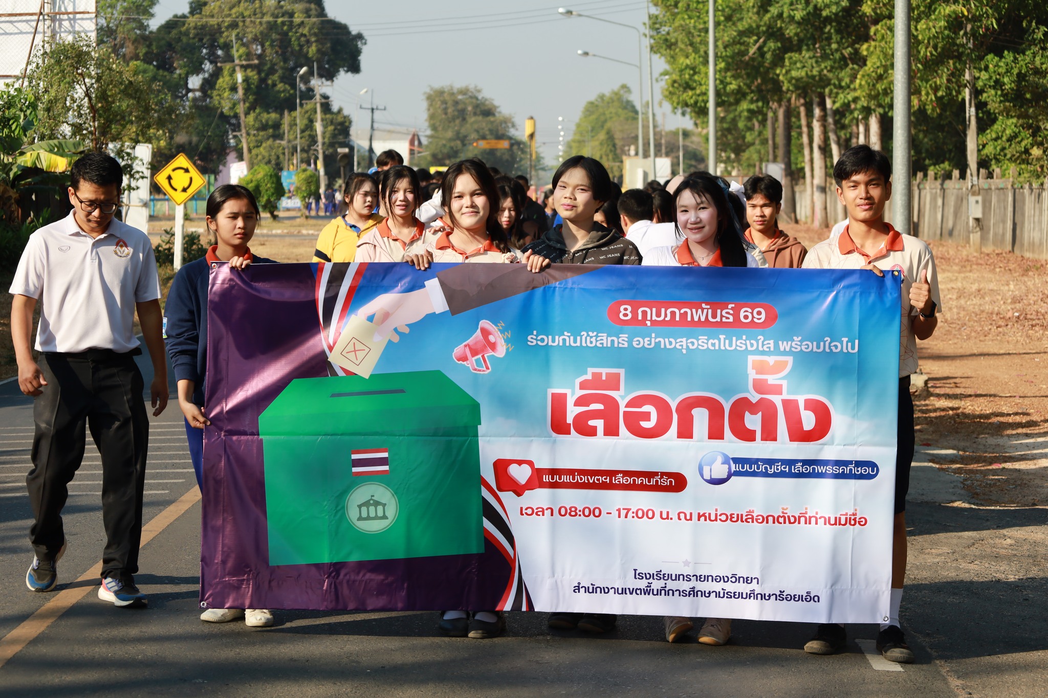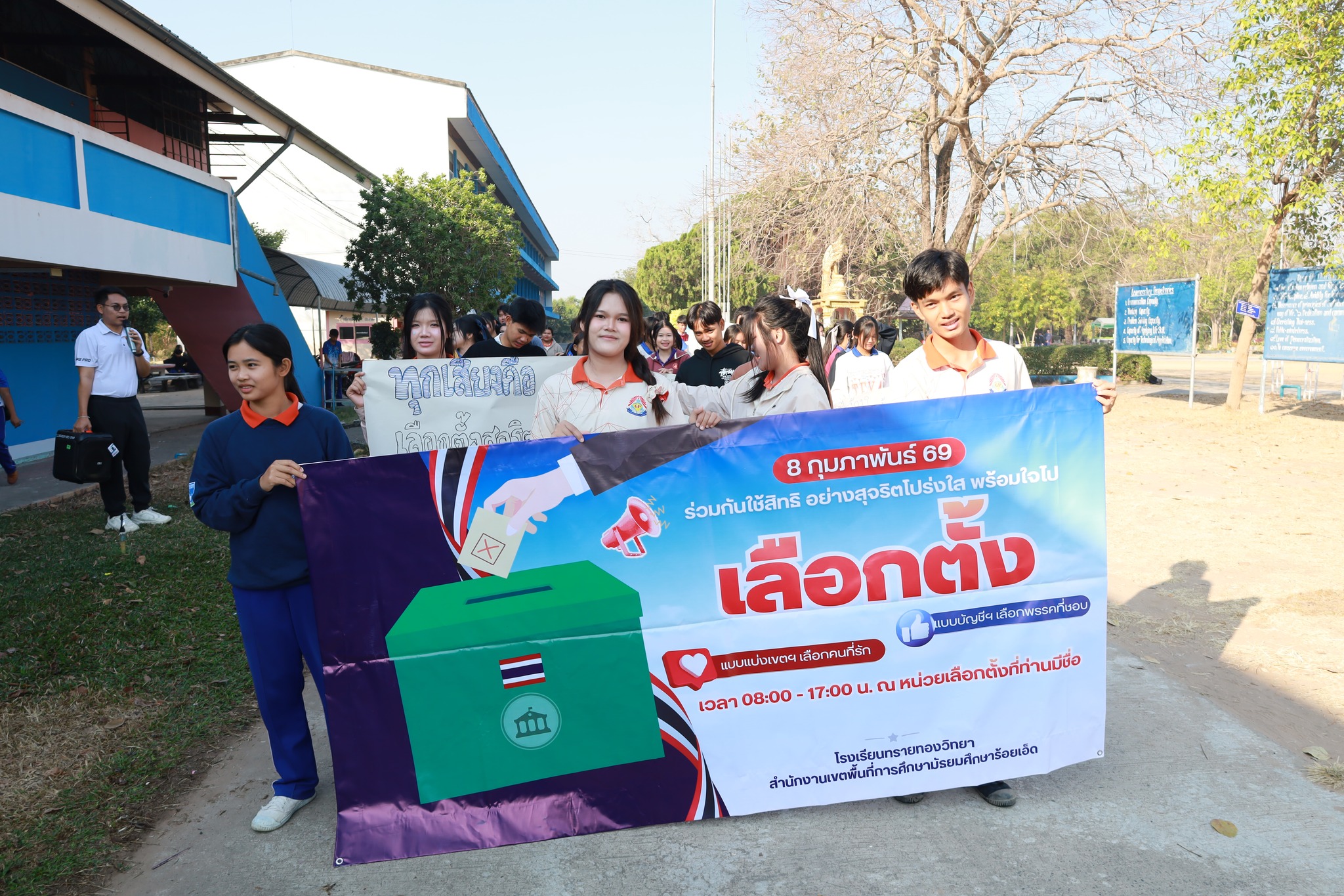 โรงเรียนทรายทองวิทยา ตำบลโพนทราย อำเภอโพนทราย นำโดยนายวิสุทธิ์ สุดหลักทอง ผู้อำนวยการโรงเรียน ฝ่ายบริหาร คณะครูและลูกๆนักเรียน มอบหมายให้กลุ่มสาระสังคมศึกษาศาสนาและวัฒนธรรม ดำเนินกิจกรรม Big Day รณรงค์โค้งสุดท้ายเลือกตั้ง สส. และออกเสียงประชามติ เชิญชวนพี่น้องประชาชนชาวอำเภอโพนทราย ออกไปใช้สิทธิเลือกตั้ง 8 กุมภาพันธ์ นี้ เพื่อแสดงออกและรวมพลังสร้างสรรค์ตามระบอบประชาธิปไตย ณ ชุมชนอำเภอโพนทราย จังหวัดร้อยเอ็ด ในวันที่ 6 กุมภาพันธ์ พ.ศ.2569